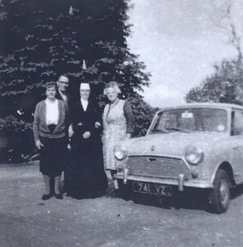 Nell McGahan, Felix Hagan, Sr Columba & Sarah Hagan pictured alongside 1000 cc Mini (1967)